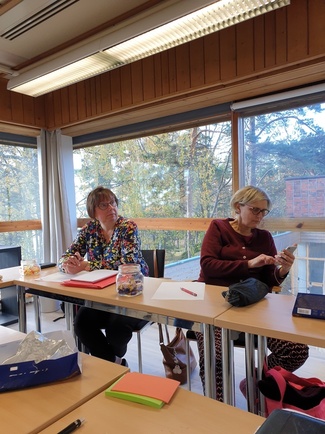 ![]() Toimintasuunnitelma koottiin perinteiseen tapaamme yhdessä. | ![]() Mari Löppönen ja Eeva Räty osallasituivat kokoukseen etänä. Edessä Riitta Velin |